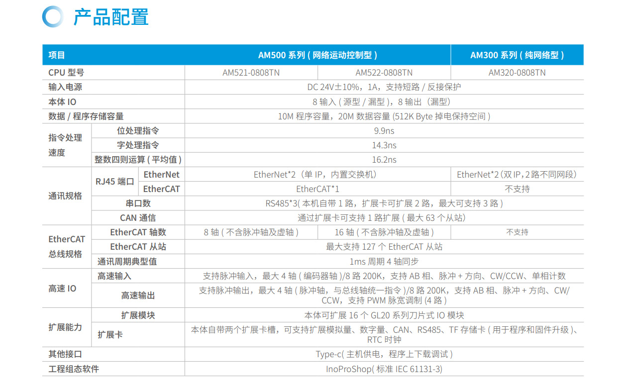 AM500系列是匯川技術推出的新一代標準型中型PLC,其設計開發完全符合PLCopen規范和IEC-61131-3標準,支持ST,LD,SFC,CFC等編程語言,以其小巧的CPU體積、模塊化靈活組合及高節拍生產特性可適應更多的應用場景。支持EtherCAT、EtherNet/IP、OPC UA、Modbus TCP(支持兩路同一網段的IP地址)、TCP/IP、RS485(最大可擴展至3路)、CAN總線等全球標準的工業網絡。主要應用于食品飲料、包裝、印刷、硅晶、醫療、SMT周邊等單機自動化設備及單機組合產線,滿足生產效率及控制精度提升場景需求。其開發編程平臺InoProShop覆蓋從多軸復雜應用、離散單機應用到基本邏輯應用,可搭載匯川技術基于ISA88標準開發的InoQuickPro標準化編程模板框架,實現規范的標準化管理開發,降低人才培訓成本。